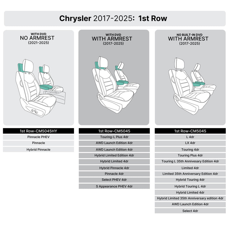 Dimensions: Customized fit for 2017, 2018, 2019, 2020, 2021, 2022, 2023, and 2024 Chrysler Pacifica