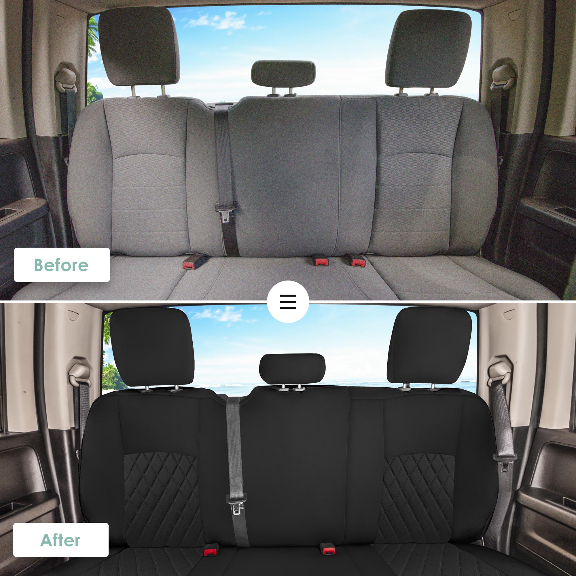 Our seat covers prioritize the maintenance of your seats without compromising on style. This set includes covers for the rear seats along with headrest covers, providing comprehensive protection and a cohesive appearance. Tailored for a perfect fit, these covers enhance your driving experience by combining comfort, practicality, and aesthetics. Upgrade your Dodge RAM 1500 Quad Cab with FH Group's custom fit seat covers, and drive with confidence knowing your truck's interior is protected and impeccably styled wherever you may go. Choose from a variety of colors to match your style