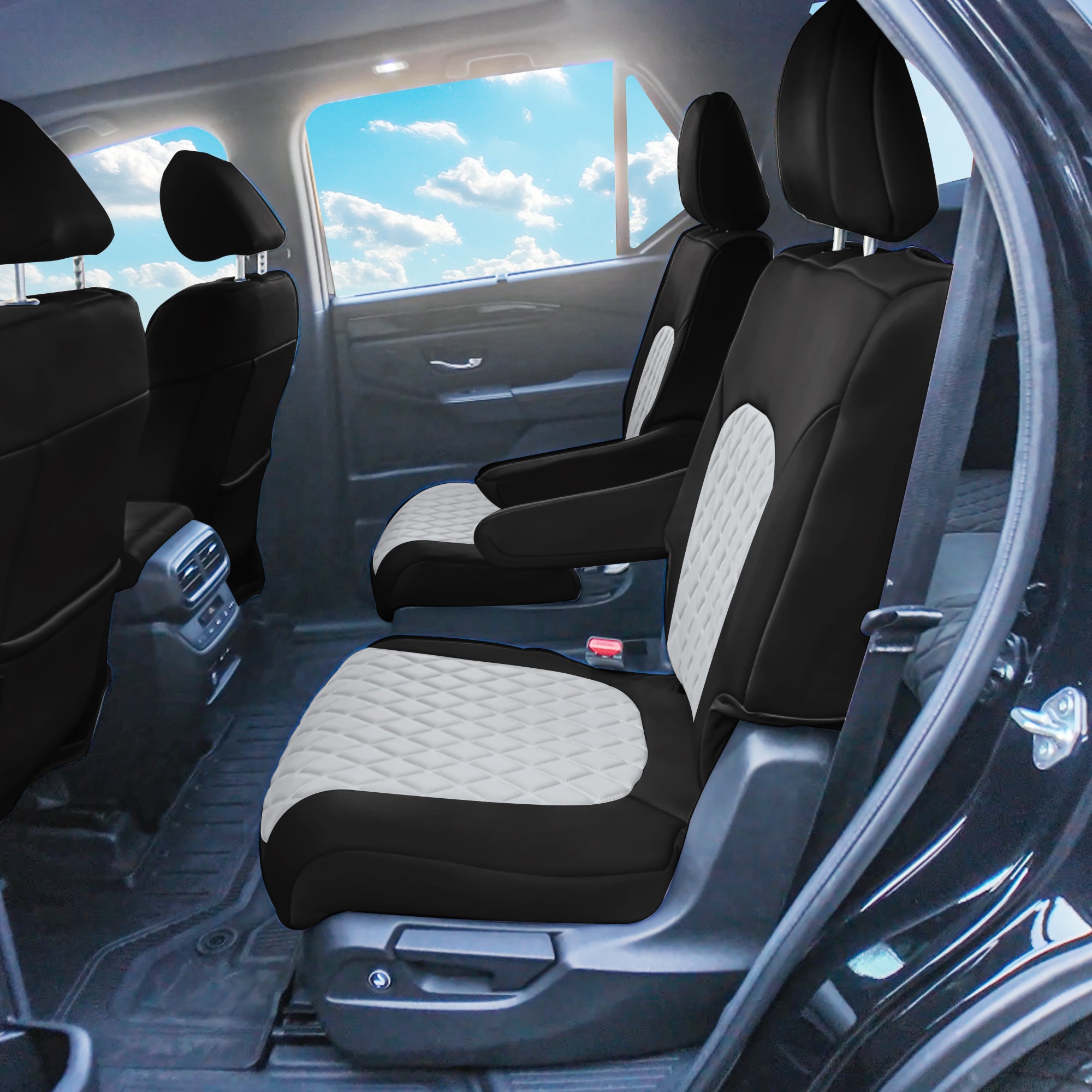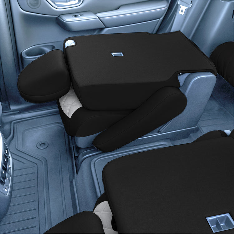 SECOND ROW CAPTAIN CHAIR COMPATIBILITY: Designed for the 7-passenger Pilot with 2 captain chairs in the second row, allowing independent seat functionality and mobility without removing the covers.