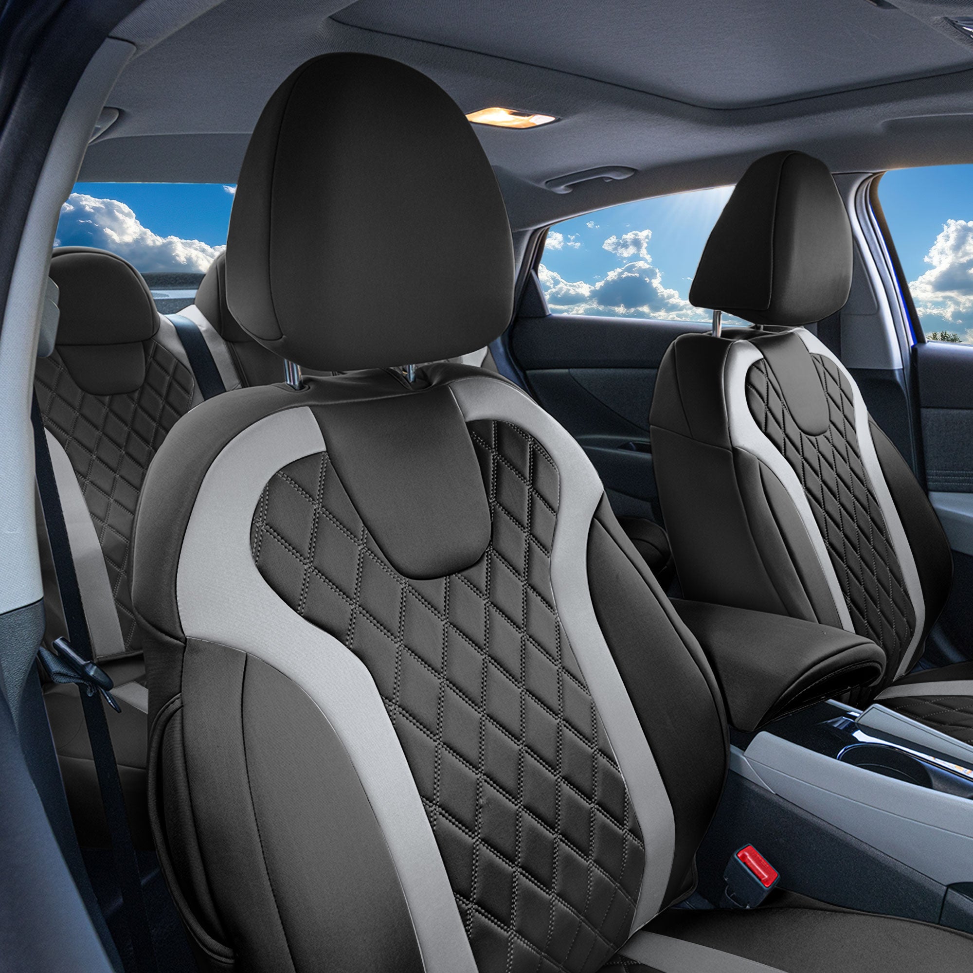 AIRBAG COMPATIBLE FRONT SEAT COVERS: Designed with safety in mind, the front seat covers are fully compatible with your Elantra’s airbags, allowing for seamless deployment in case of an emergency.