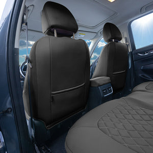 Safety and convenience are at the heart of this design. The front seat covers are fully airbag compatible, ensuring that your vehicle’s safety features remain fully operational. The set includes a matching front center console cover for added protection and a cohesive look. With removable headrests in the front, the covers fit snugly while allowing easy adjustments. Available in black and gray, these seat covers let you personalize your interior to match your style. Experience the perfect blend of protection, comfort, and style with our expertly crafted neoprene seat covers.