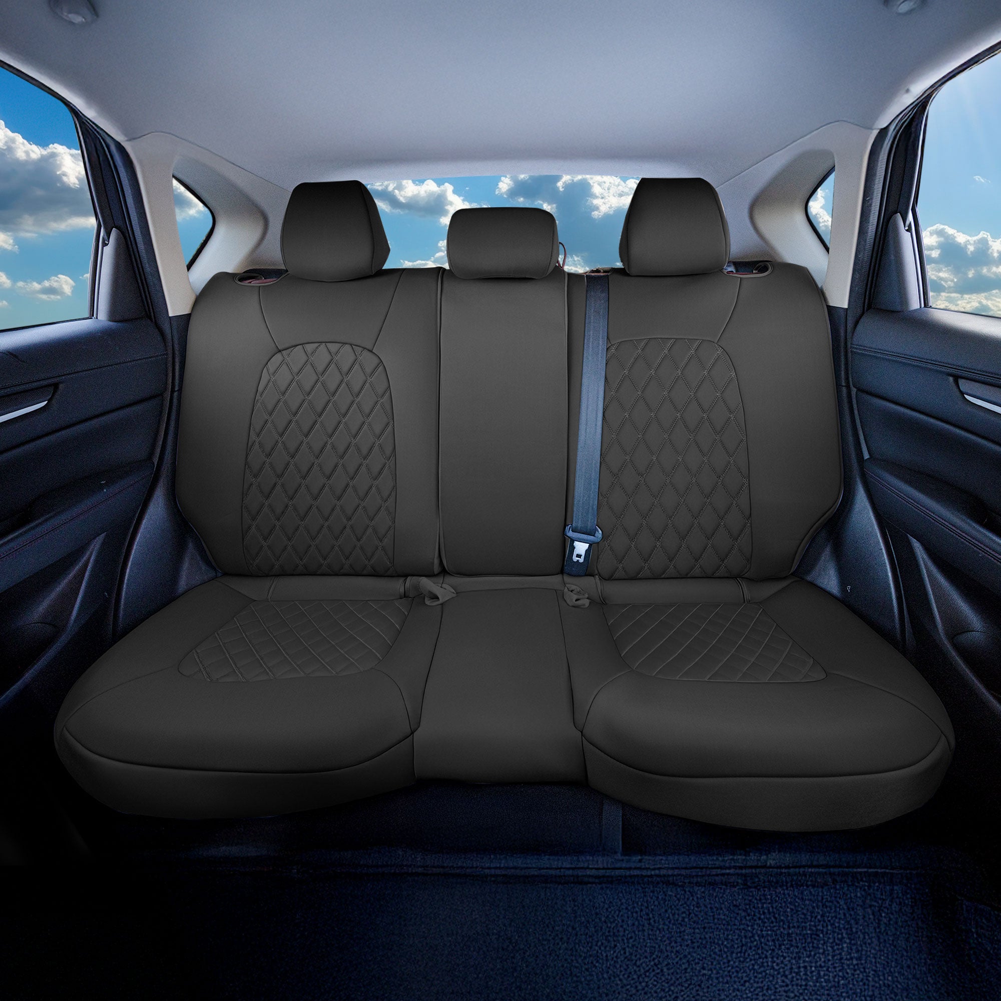 Safety and convenience are at the heart of this design. The front seat covers are fully airbag compatible, ensuring that your vehicle’s safety features remain fully operational. The set includes a matching front center console cover for added protection and a cohesive look. The rear seat configuration features a split backrest design (40/20/40), with three individual backrest covers and a solid bottom seat cover for seamless installation and full coverage. With removable headrests in both the front and rear, the covers fit snugly while allowing easy adjustments. Available in black and gray, these seat covers let you personalize your interior to match your style. Experience the perfect blend of protection, comfort, and style with our expertly crafted neoprene seat covers.