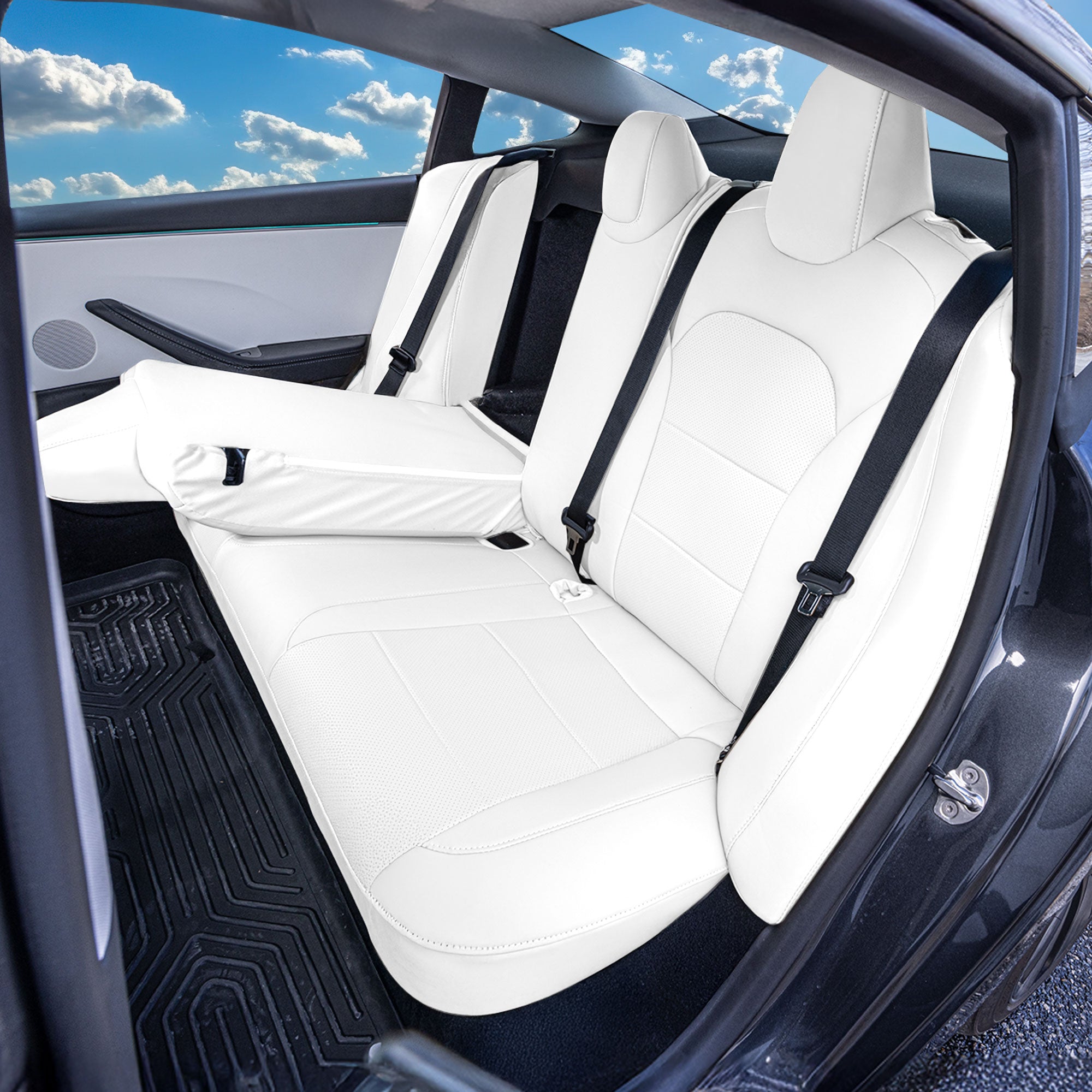 Designed for the refreshed Model 3 rear layout, this set includes two rear backrest covers and two rear bottom covers for consistent, OEM-style coverage. The tailored fit helps prevent bunching and shifting after passengers get in and out. Ideal for families, rideshare drivers, and owners who want a polished interior with minimal maintenance. Available in Black or Solid White.